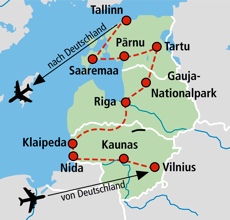 Ihre Reise führt Sie von der alten Barockstadt Vilnius, durch die atemberaubenden Dünenlandschaften der Kurischen Nehrung und mitten ins Herz des Baltikums. Sie besuchen das malerische Nida und das stolze Riga, die traditionsreiche Stadt Tartu, den Gauja-Nationalpark mit seinen beeindruckenden Naturdenkmälern sowie die idyllischen Inseln Saaremaa und Muhu. Im mittelalterlichen Tallinn findet diese ganz besondere Reise ihren würdigen Abschluss.